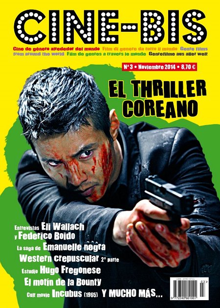 En este último número publicado, la imagen de portada está dedicada al actor coreano Bin Won, y está extraída de la película El hombre sin pasado (Lee Jeong-beom, 2010), curiosamente una muestra de aperturismo generacional por parte del director de la publicación -las dos portadas anteriores hacían hincapié en los géneros de Blaxploitation y el western crepuscular, de los años 60 y 70-. Esta poderosa imagen (el protagonista, con rostro y manos sangrantes, sostiene su arma con gesto concentrado y actitud amenazante) refiere al artículo que abre el número (tras la pertinente editorial y la introducción, que recopila reseñas y comentarios sobre el número 2): “El thriller coreano”, un excelente y documentado repaso a la historia del cine negro hecho en Corea desde los años 40; una exquisita oportunidad para el descubrimiento de gemas sepultadas a lo largo de los años. Viene firmado por uno de los mejores autores jóvenes del panorama patrio: Adrián “Esbilla” Sánchez (esbilla.wordpress.com).