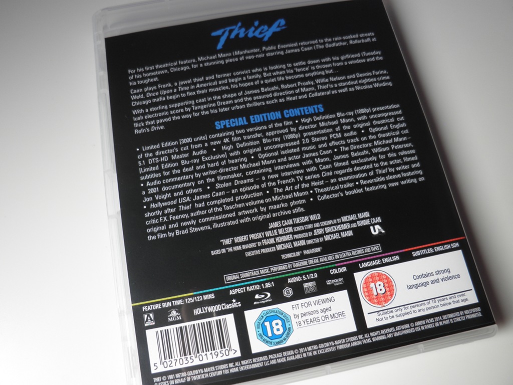 La última joya de la corona de este sello imprescindible es la recuperación de Thief (Ladrón), el meritorio debut cinematográfico de Michael Mann (Heat, Blackhat). Y es doblemente especial porque si el hecho de su aparición es en sí mismo relevante, lo es más cuando al aficionado se le da la oportunidad de escoger: en esta edición especial (y limitada a 3000 unidades) caben dos versiones de la película: el reciente montaje del director -editado previamente por Criterion a partir de una masterización a 4K- y el montaje clásico estrenado en cines, también presentado en una impecable imagen en alta definición (sobra decir que la película se ve y se escucha como nunca en la pantalla de nuestro televisor). Lo curioso es que es este último el que se presenta como bonus en la edición, y es que una vez agotada ésta, la película sólo podrá adquirirse en el nuevo montaje que realizó y supervisó para la mencionada firma americana el propio realizador. Un corte polémico, ya que en él no sólo figuran nuevas escenas añadidas o expandidas (que hacen algo más larga la duración, aunque no demasiado por su compensación con otras), sino que, además, altera la colorimetría con la que fue inicialmente concebido (y estrenado) el filme, virando a una paleta azul típica en las realizaciones más modernas de Mann (véase Miami Vice como ejemplo más claro). Pueden observarse las diferencias para un mismo fotograma encima de este párrafo.